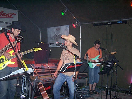 Konnte sich schon sehen lassen. Das Platzangebot war sehr beengt. Den Notenständer mußte er mit Gaffatape am PickUp festkleben. |